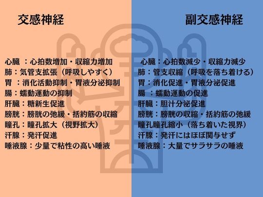 身体を動かす時は主に交感神経が活動し、休息をする時は副交感神経が活動を高めるのが通常の状態です。
