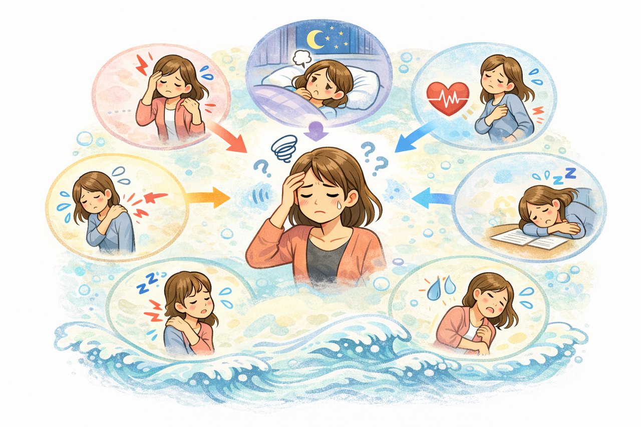 不定愁訴はひとつの症状だけでなく、複数の不調が重なり、波のように変化しやすいのが特徴です。
