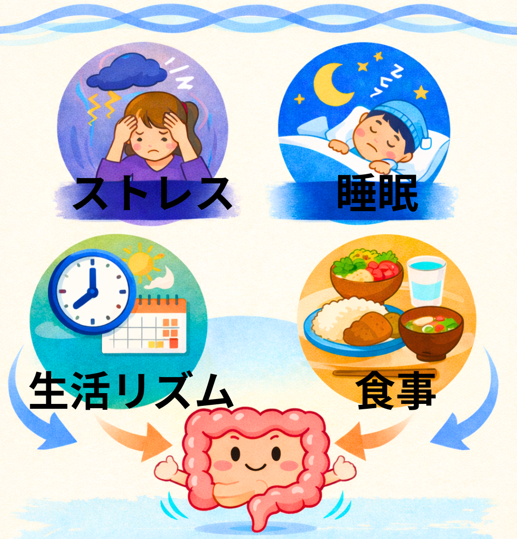 IBSは腸だけの問題として単純に考えにくく、ストレス、睡眠、食事、生活リズム、緊張の強さなど、複数の要因が重なって波のように出やすいことがあります。